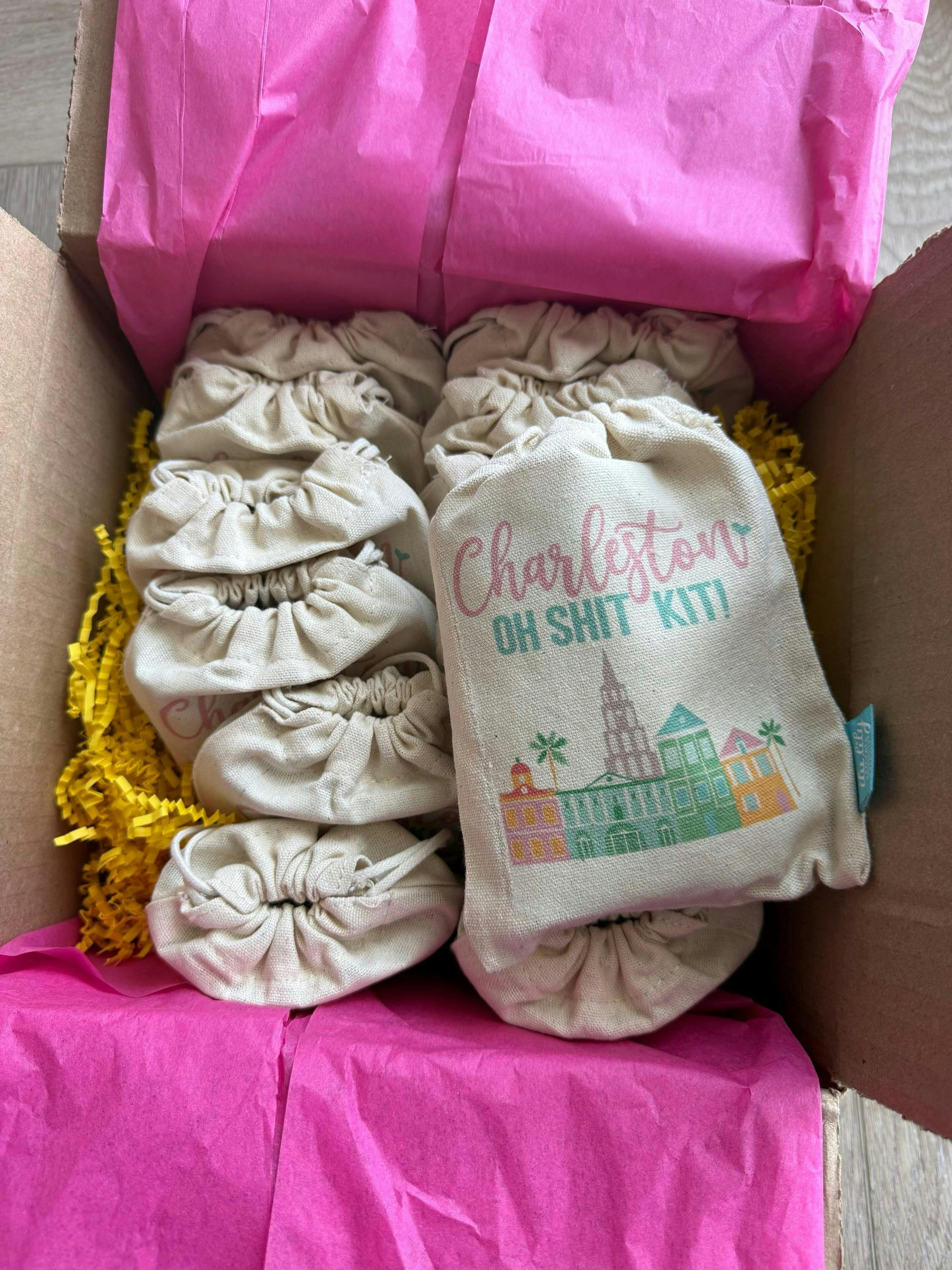 PRODUCT INFOFeaturing the colorful Charleston skyline and customizable with the bachelorette's name and event date, our "oh shit kit" bags are the PERFECT favor and memento for your Charleston bachelorette bash! Fill them with necessities for the night out and morning after, or let us do all the work! Choose from our packages and filler options to have them arrive stuffed and ready to gift. The girls will definitely appreciate the love put into these, especially after an awesome night of celebrating the bride-to-be!STYLE DETAIL• Our mini favor bags measure 5” x 7” and are made out of 100% natural cotton canvas with a cotton drawstring for secure closure. They are durable with reinforced stitching within for extra strength.• Wording can be adjusted to your desire along with details and colors.