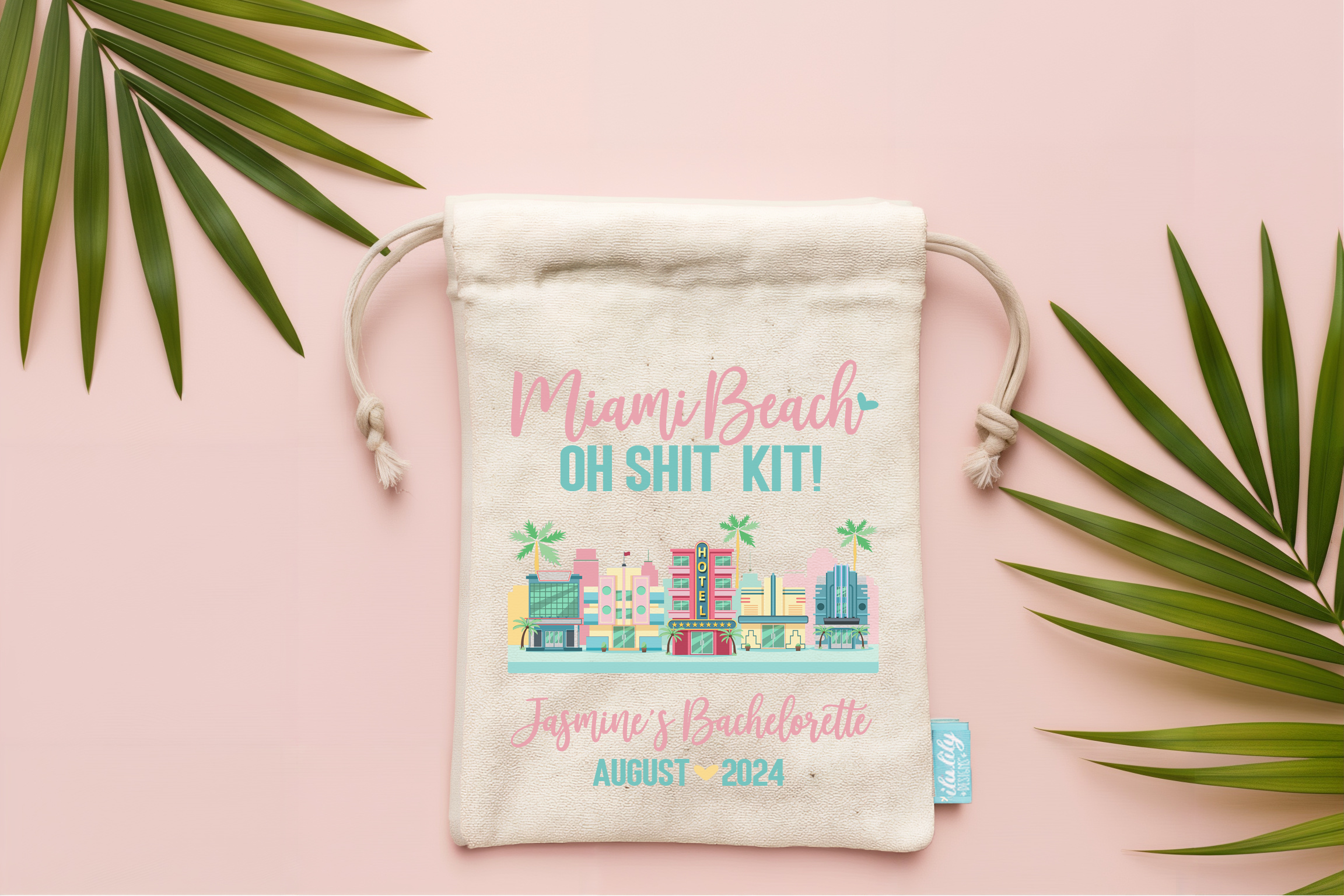 PRODUCT INFOFeaturing the colorful Miami skyline and customizable with the bachelorette's name and event date, our "oh shit kit" bags are the PERFECT favor and memento for your Miami Beach bachelorette bash! Fill them with necessities for the night out and morning after, or let us do all the work! Choose from our packages and filler options to have them arrive stuffed and ready to gift. The girls will definitely appreciate the love put into these, especially after an awesome night of celebrating the bride-to-be!STYLE DETAIL• Our mini favor bags measure 5” x 7” and are made out of 100% natural cotton canvas with a cotton drawstring for secure closure. They are durable with reinforced stitching within for extra strength.• Wording can be adjusted to your desire along with details and colors.