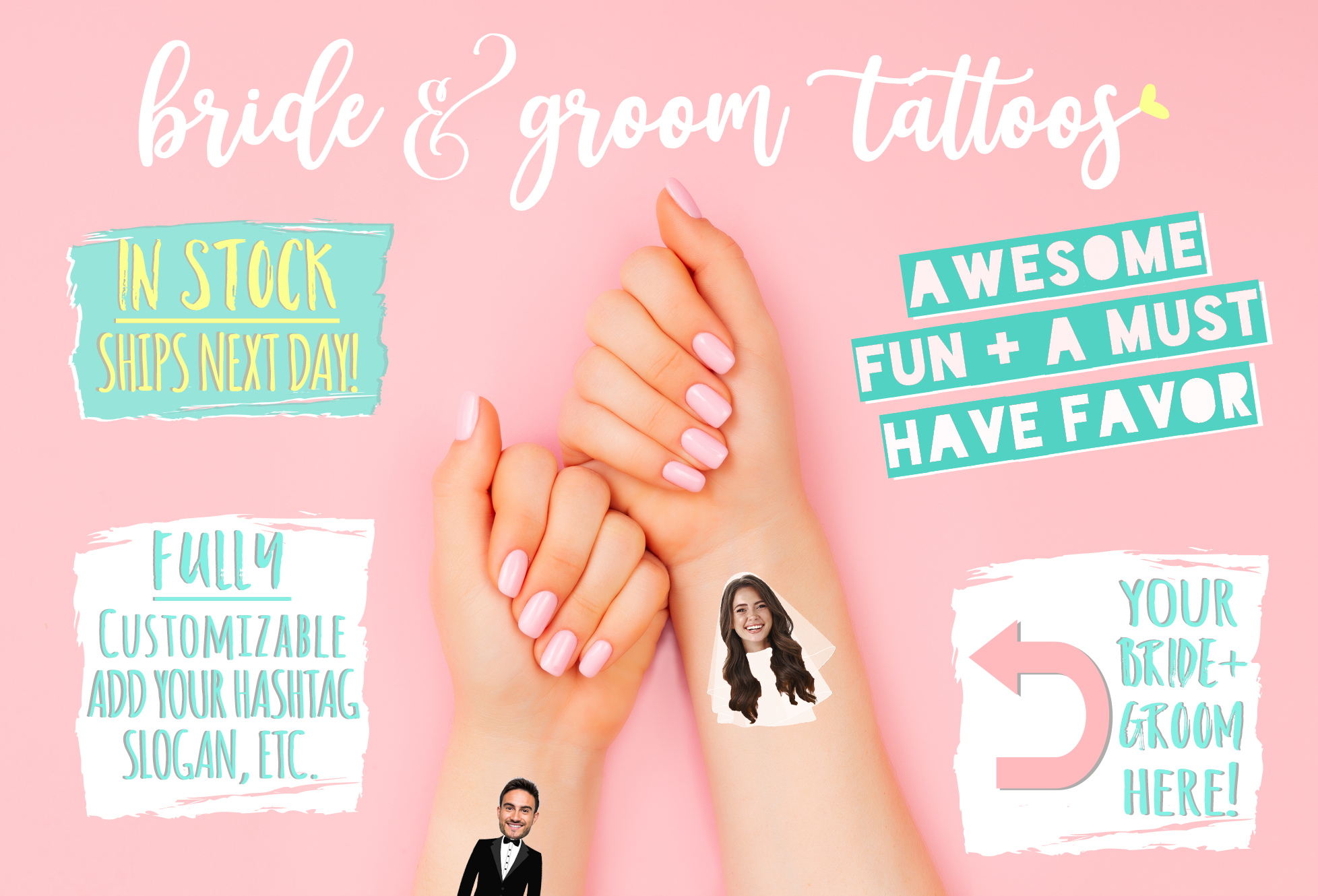 Add an instant shot of excitement, fun and all-around awesomeness to your wedding with our fab + fun custom temporary tattoos. Your tattoos will include the displayed veil for the bride and suit for the groom along with your provided photo. Your guests will love rocking tattoos of the bride + groom. Also, a great engagement party or bridal party favor idea. Our tats will for sure doll up your photobooth photos.