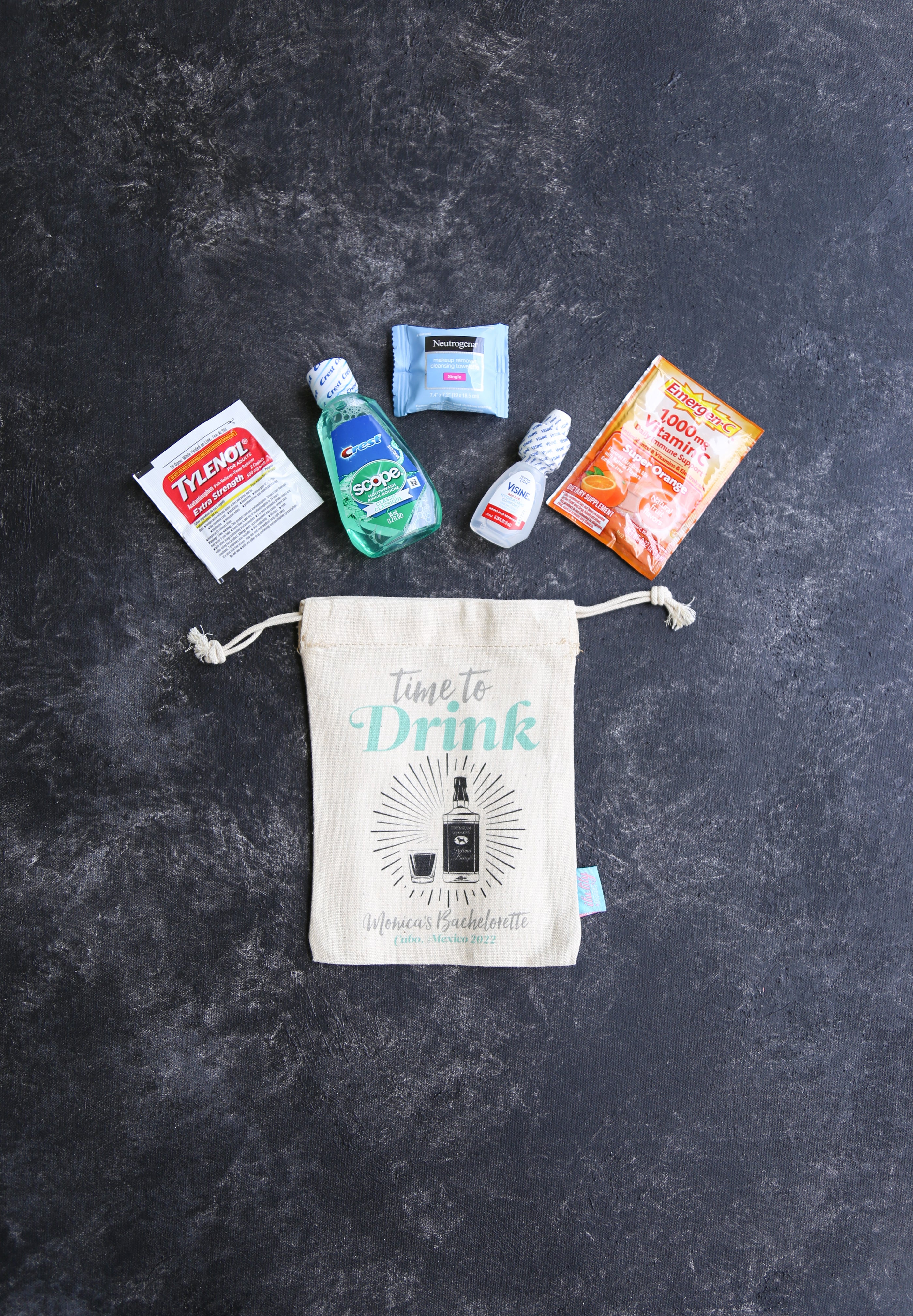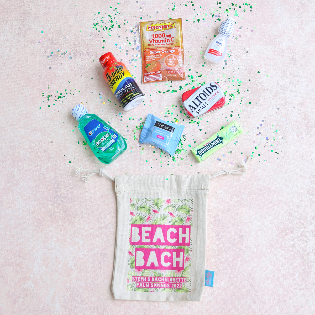 These fab little favor bags help keep the party and afterparties going. Filler items are available so that kits arrive ready to gift.